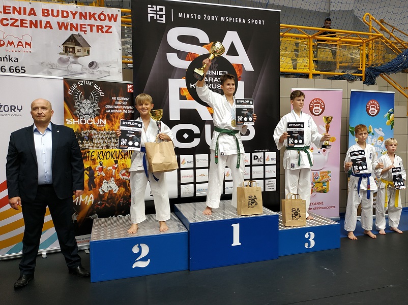 Maksymilian Wojtas – w kategorii kumite juniorów do 65kg. Maksymilian w walce ćwierćfinałowej uzyskał znaczącą przewagę przeprowadzając liczne kombinacyjne ataki technikami ręcznymi i nożnymi, co potwierdzili sędziowie jednogłośnie w swoim werdykcie przyznając mu zwycięstwo po zakończeniu pojedynku. Druga walka została rozstrzygnięta przez Maksymiliana przed czasem (ippon) za sprawą dwukrotnego trafienia rywala okrężnym kopnięciem na głowę. Starcie finałowe przebiegało od początku dla Maksymiliana bardzo pomyślnie za sprawą uzyskiwanej przewagi, która powiększała się wraz z czasem trwania walki. Ta przewaga dała Maksymilianowi możliwość wypracowania skutecznej kombinacji, w wyniku której zaliczył trafienie rywala okrężnym kopnięciem na głowę (waza-ri) co przyniosło mu ostatecznie zwycięstwo w tej kategorii.